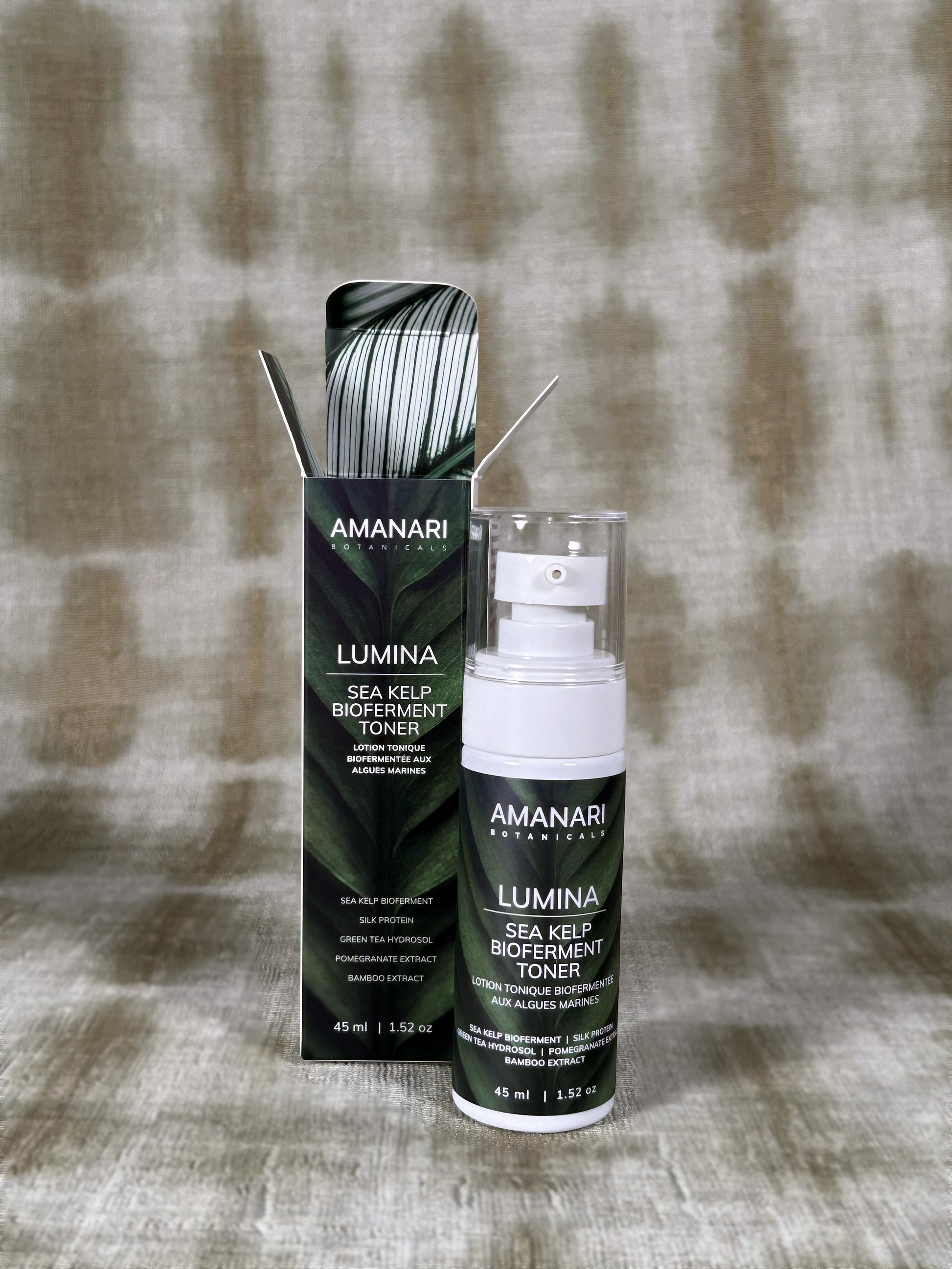 After cleansing, dispense 1–2 pumps of Lumina Toner onto a cotton pad or into clean palms. Gently press into your face and neck, allowing the bioferments and botanical actives to absorb fully. Use morning and night as the first step in your skincare ritual—before serums, moisturizers, or face oils.