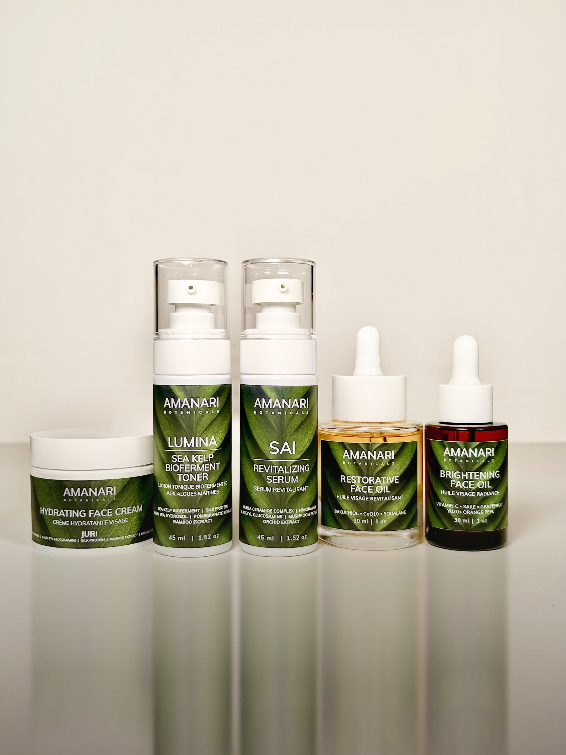 Transform daily skincare into a grounding self-care ceremony. This complete Amanari Ritual –– featuring our Sea Kelp Bioferment Toner/Softener, SAI Ceramide-Rich Serum and Niacinamide , JURI Hydrating Moisturizer, and our AM/PM Face Oils –– layers hydration, nourishment, and barrier-support, while surrounding you with the calming, nature-inspired scents at the heart of our formulations.